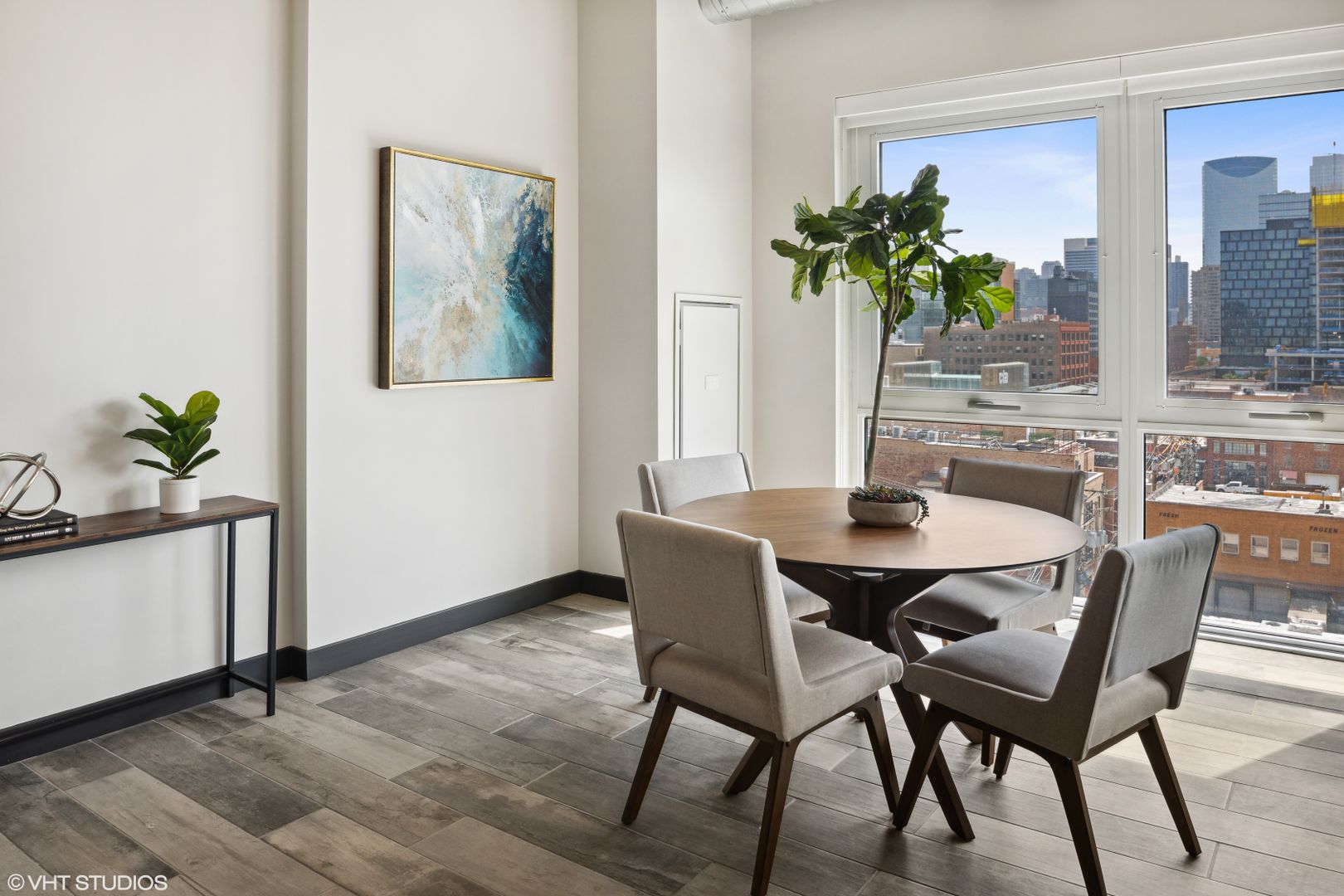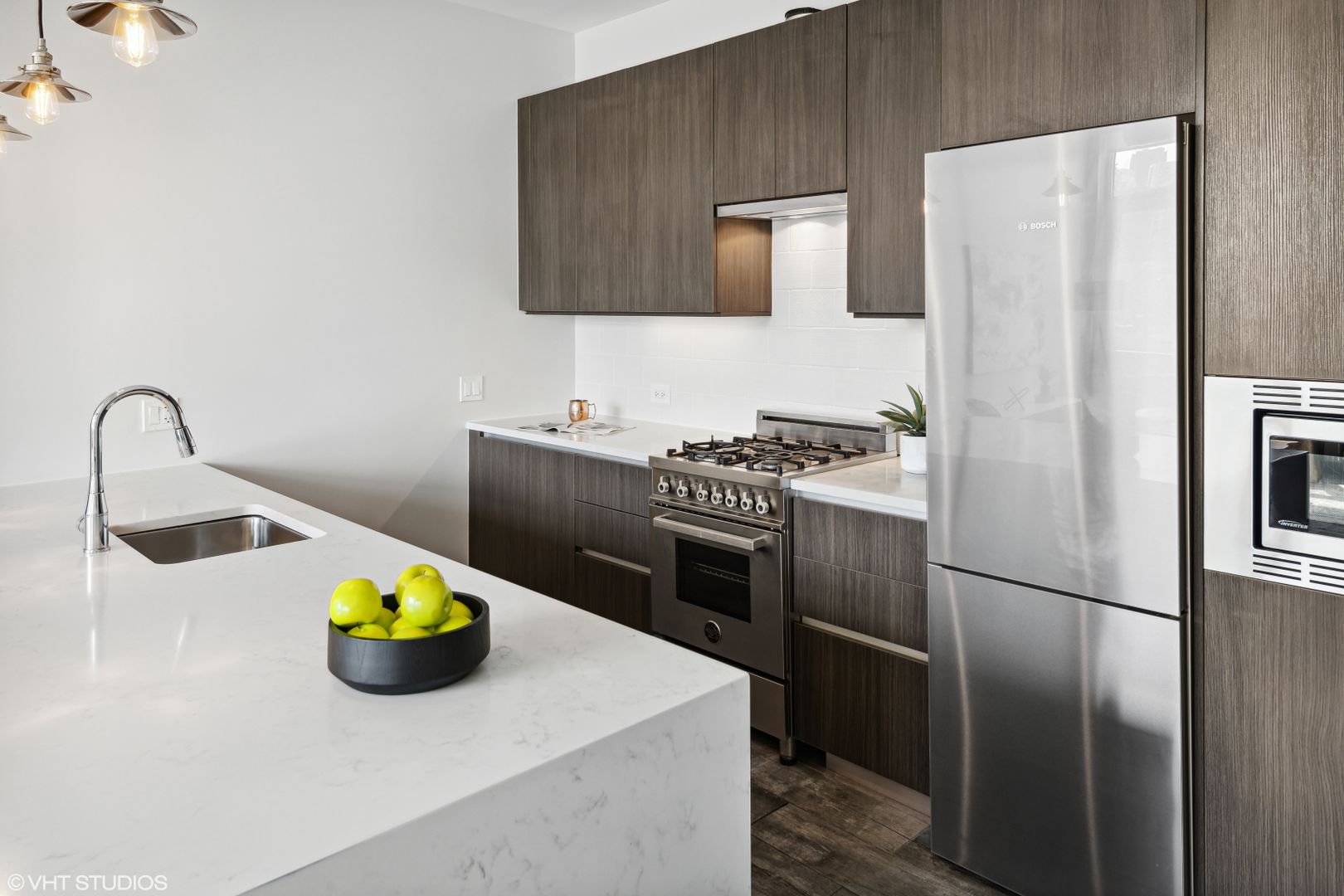 This two bedroom, two bathroom industrial-chic apartment features an updated eat-in kitchen with Bosch stainless steel appliances & a Bertazzoni range. Showcasing floor to ceiling, wall-to-wall east-facing windows, wake up every morning to stunning city views. Entertain with ease on the over-sized private terrace. In-unit washer/dryer. Enjoy Aberdeen East's amenities that include a rooftop terrace with panoramic views of Chicago, fitness room, bike room & lounge that's perfect for a change of scenery when working from home. Situated in between Chicago's West Loop & Fulton Market neighborhoods, the area is a foodie's utopia with a thriving restaurant district on Randolph Street ("Restaurant Row") & on Fulton Street, offering up everything from casual neighborhood dining to haute cuisine prepared by some of the city's finest restaurants & celebrity chefs. The neighborhood is served by the CTA Green, Pink line trains as well as several bus routes. It also offers convenient access to the Kennedy Expressway. Internet is included. Photos are of a unit with the same interior floorplan. Actual unit has white cabinetry throughout + private terrace.